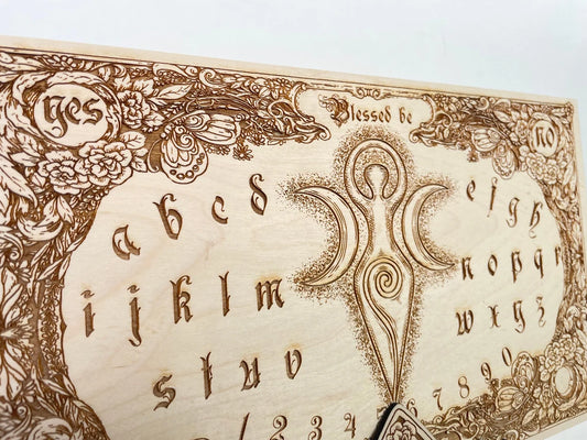 Wooden Ouija board engraved with flowers and wiccan triple moon goddess, floral moon pagan spirit board with planchette, positive Ouija board.