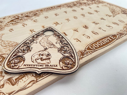 Ouija board wood engraved with ravens and gothic elements, gothic raven and skull spirit board with planchette.