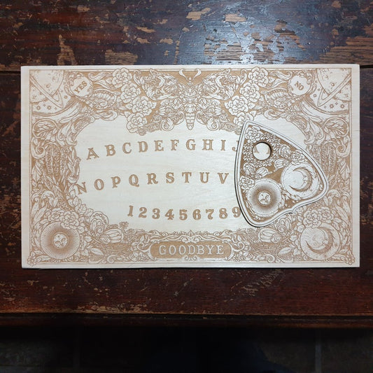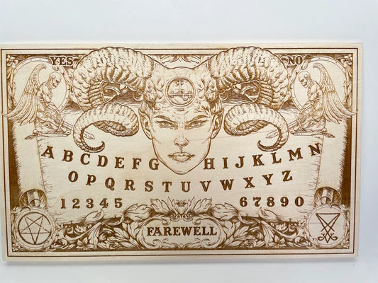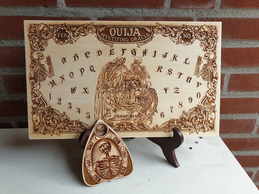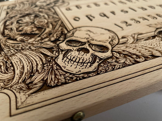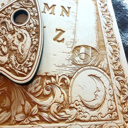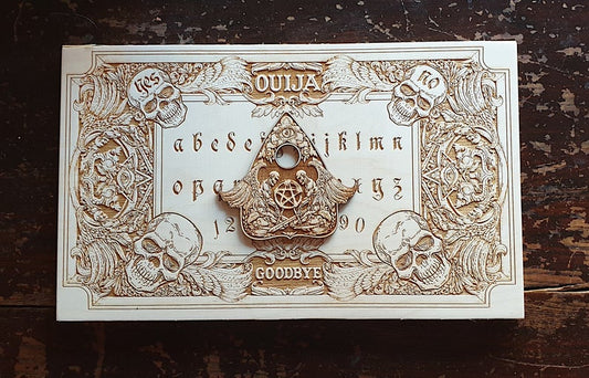 Wooden Ouija board game with demons and skulls wooden engraving, spirit board original design.