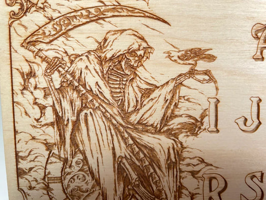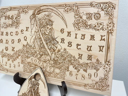 Ouija board wood with Grim Reaper theme wooden engraving, wood memento mori spirit board
