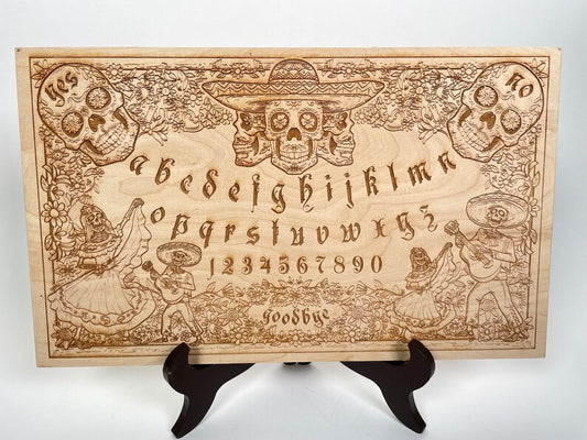 Ouija board with sugar skull dia de los Muertos theme wooden engraving, wood day of the dead decor spirit board sugar skull design.