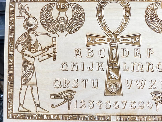 Ouija board Egyptian wooden engraving, wood gothic skull spirit board Anubis and Horus.