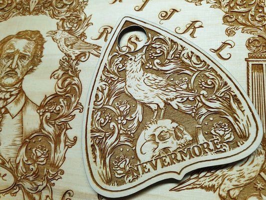 Ouija board game with Edgar Allan Poe portrait wooden engraving
