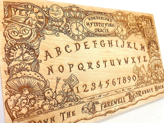 Ouija board with Alice in Wonderland theme, spirit board made of wood for Alice in wonderland fans.