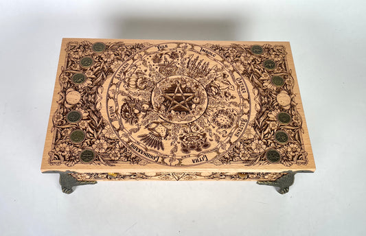 Wheel of the Year Wiccan Altar Table with Storage – Wooden Pagan Altar & Tarot Organizer