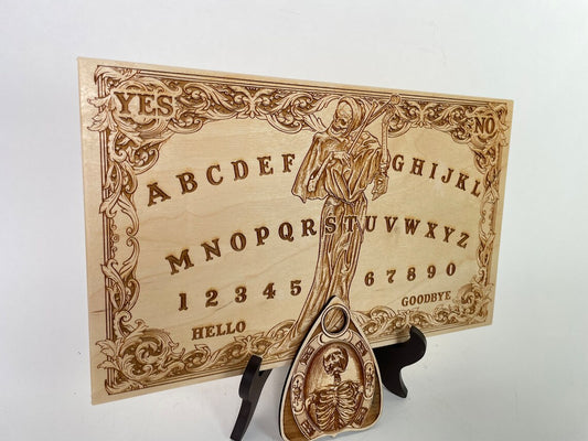 Wooden Ouija board Memento mori Spiritus Tabula engraved with planchette, Ouija board with vintage design, spirit Board death playing violin.