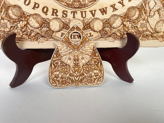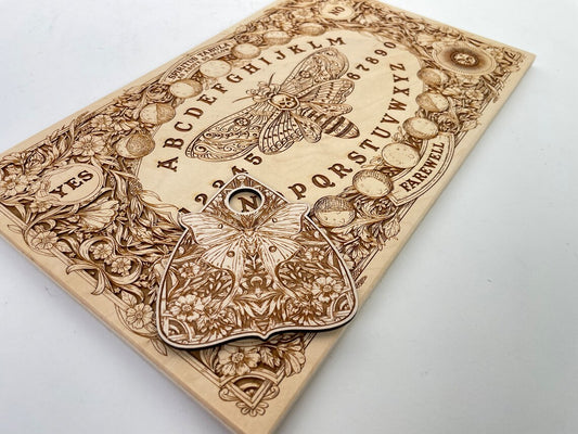 Ouija board wood engraved with Deaths head hawk moth, moon pagan spirit board with sun and moon planchette, wiccan witchy gift for her