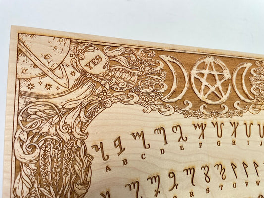 Witchcraft Ouija board wood engraved with Theban alphabet and triple moon pentacle, floral pagan wooden positive wiccan Ouija game.
