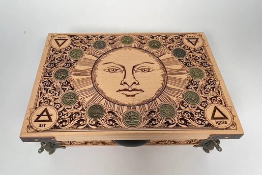 Wooden box for tarot cards with Alchemy symbols engraved on wood for tarot deck