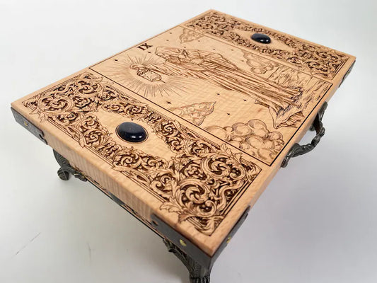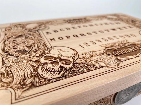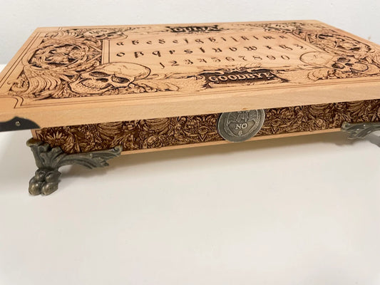 Luxury Ouija board box with demons and skulls wooden engraving, wood gothic skull spirit board two in one box, tarot box with Ouija board.