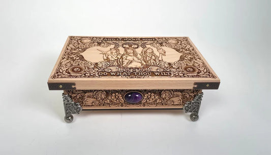 Wooden box for tarot cards with wiccan design, crystal holder with triple moon, Do What Thou Wilt box, wiccan altar box.