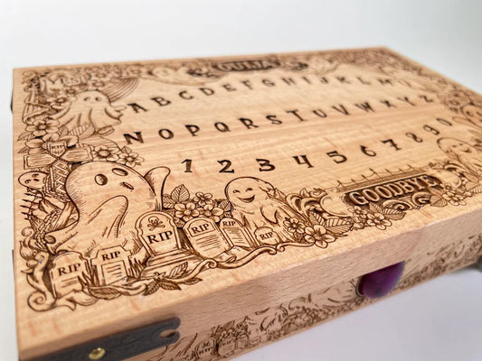 Wooden box for tarot cards with cute Ouija board game cover engraving, tarot deck holder keepsake box, ghost jewelry box.