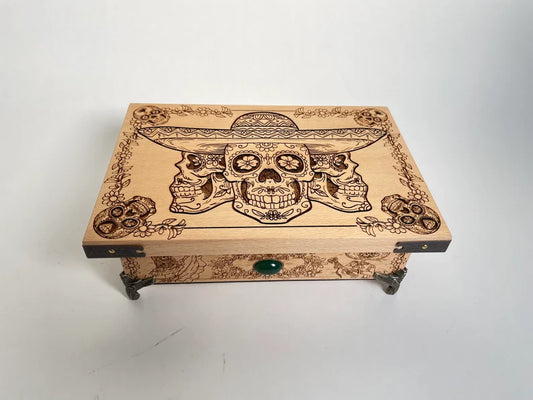 Sugar Skull keepsake box and cover engraved with day of the dead theme, wooden dia de los Muertos tarot box, wooden Tarot jewelry box.