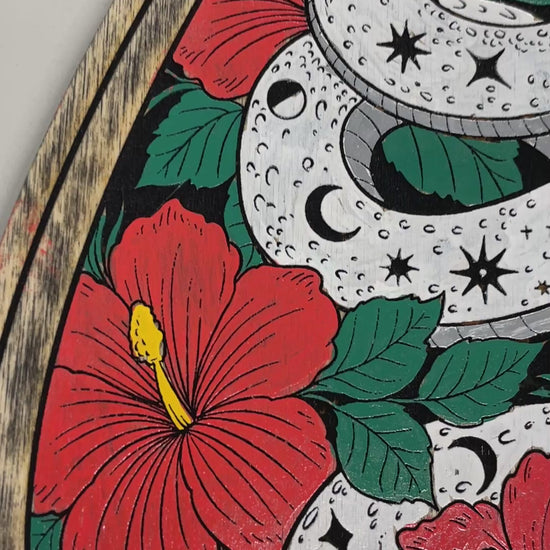 This celestial Ouija board planchette wall art features a mystical serpent decorated with stars, crescent moons, and cosmic symbols, surrounded by vivid hibiscus flowers and lush green leaves. The design blends occult symbolism with botanical beauty, creating a striking statement piece for alternative interiors.