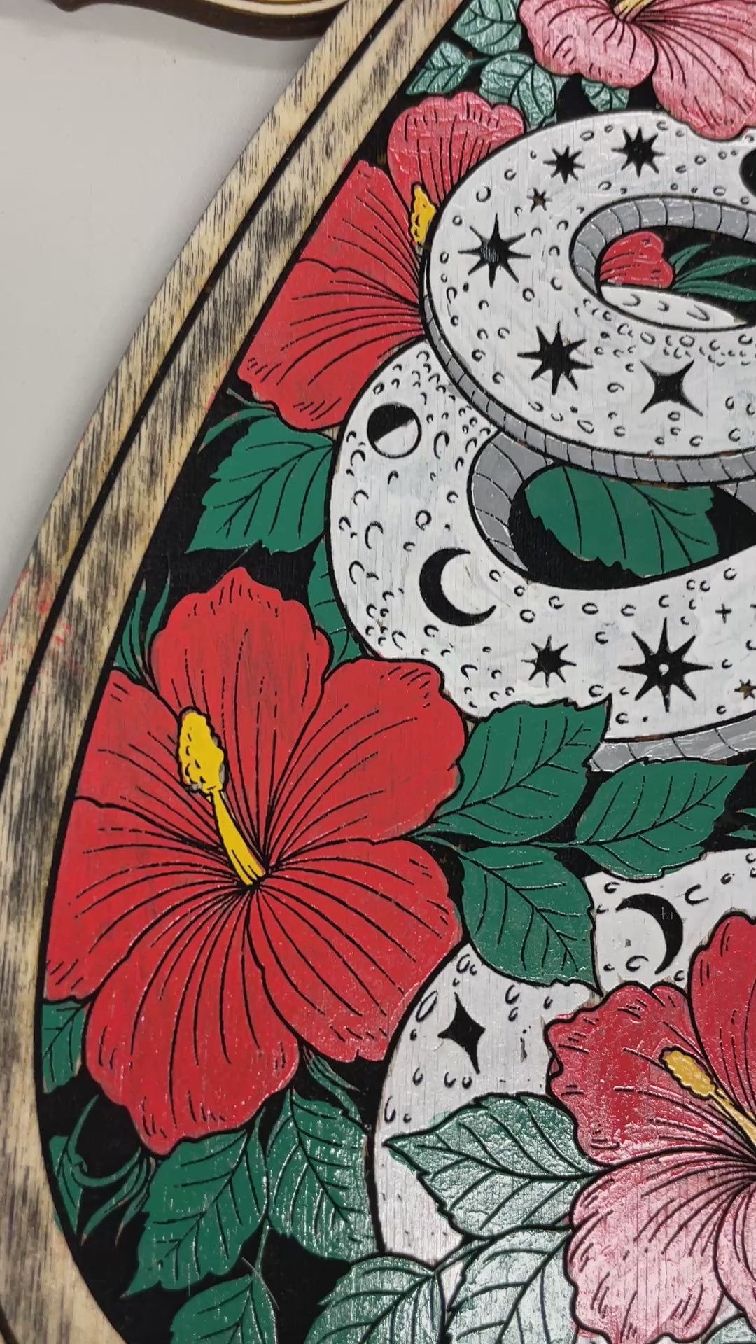 Celestial Snake Ouija Planchette Wall Art – Hand Painted Spirit Board Decor with Hibiscus Flowers