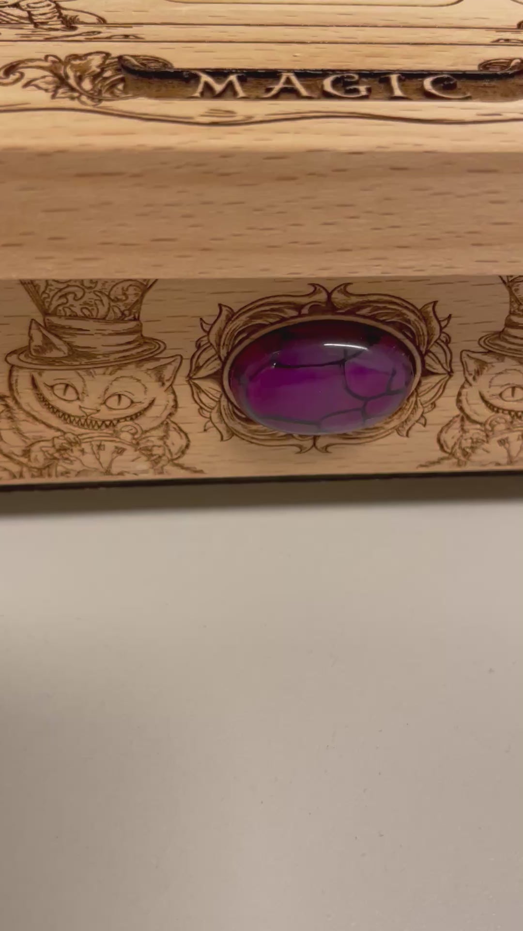 Featuring engraved Wonderland imagery on the lid and sides, this wooden box is perfect for storing tarot and oracle decks, crystals, jewelry, and sacred tools. Its whimsical Alice in Wonderland theme makes it a joyful addition to any collection or spiritual space.